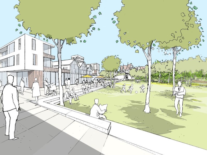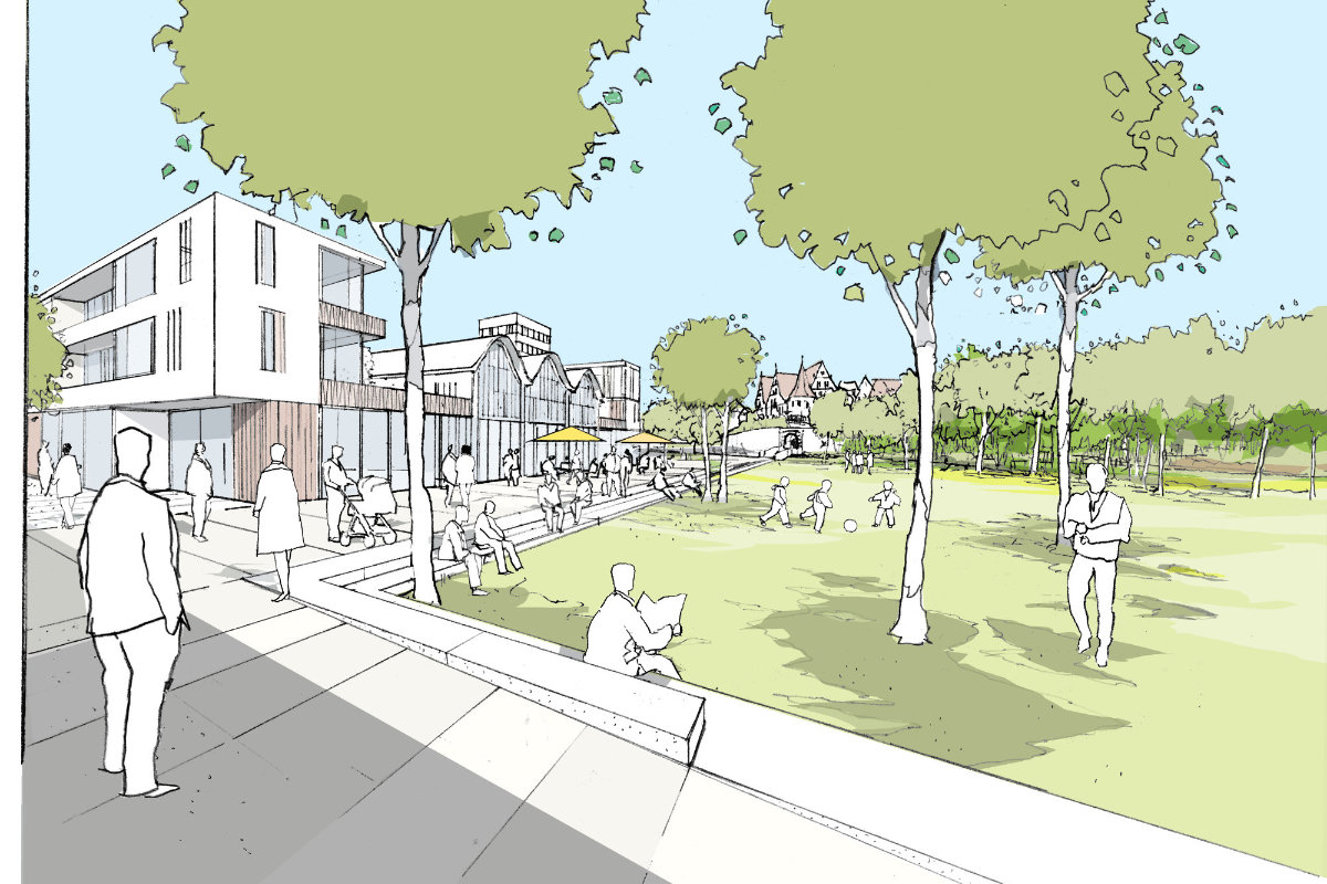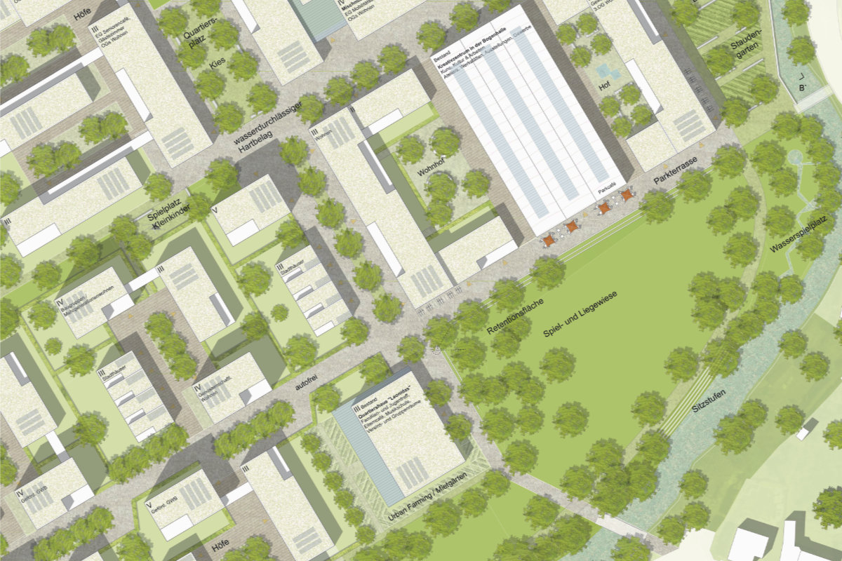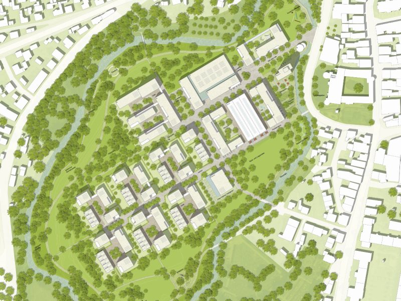 Eingebettet in einen großzügigen Landschaftspark gliedert sich das neue Stadtquartier in zwei Bereiche unterschiedlicher Charakteristik. Der Stadt unmittelbar zugeordnet sind drei Baufelder angeordnet, die mit deutlicher Fassung der Räume und Blockstrukturen eine eher städtische Atmosphäre prägen. Daran anschließend liegen Wohnhöfe mit einer gartenstädtischen Anmutung.