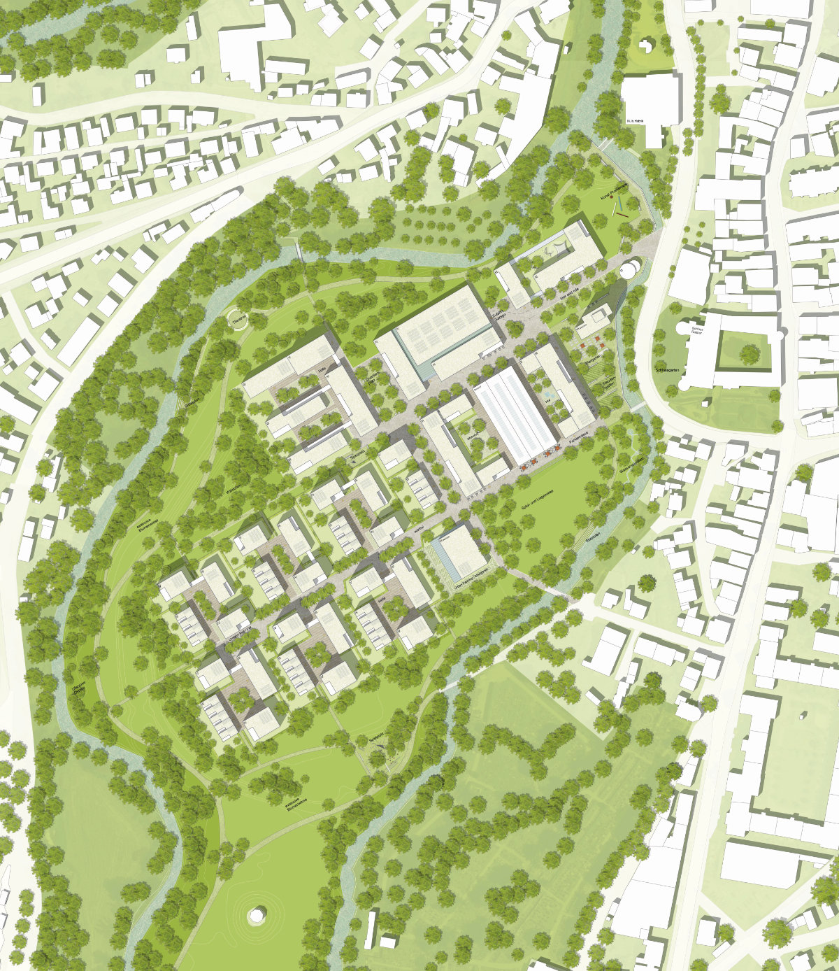 Als dritter Baustein schließt das Kreativviertel mit der alten Gewerbehalle im Zentrum den städtischen Bereich ab. Es beherbergt eine Mischung von künstlerisch-kulturellen als auch gewerblichen Aktivitäten. Als durchgehendes Gebäude ist die Halle sowohl der zentralen städtischen Achse als auch dem Park zugeordnet und damit als transitorischer Raum für öffentlichkeitsbezogene Nutzungen wie Ateliers, Restaurant und/oder  Café́ in besonderer Weise geeignet. Das Gartenstadtquartier umfasst als zweiter großer Quartiersbaustein auf der Grundlage nachbarschaftlicher Wohnhöfe unterschiedliche Formen des Wohnens: vom betreuten Wohnen, über genossenschaftliche Wohnformen bis hin zu Eigentumswohnungen.