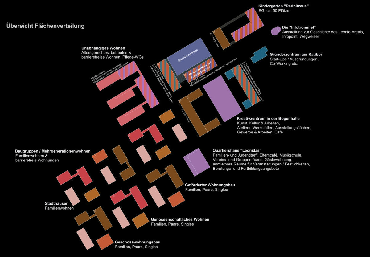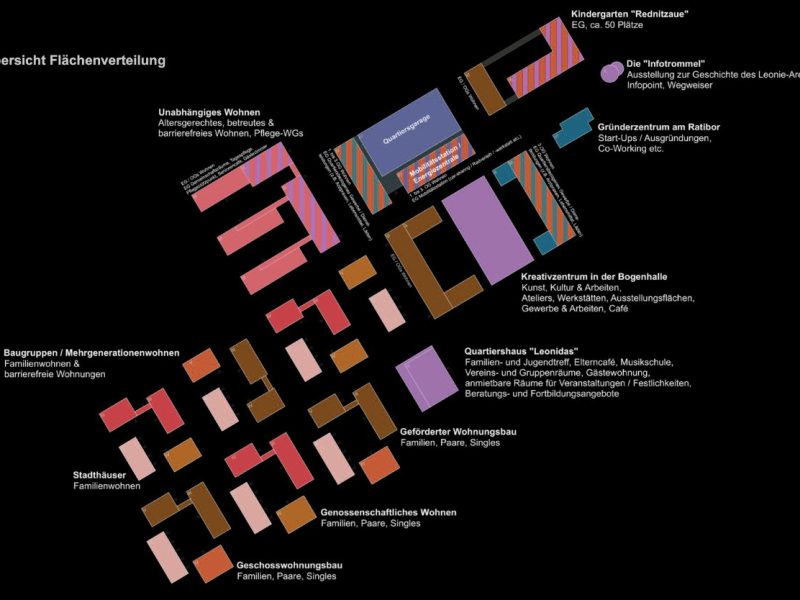 Die einzelnen Baufelder zeigen eine unterschiedliche Programmatik: Den Auftakt bildet ein Block, in dem erdgeschossig ein Kindergarten angeordnet ist. In den Obergeschossen befindet sich Wohnen. Die erforderlichen Freiflächen für den Kindergarten sind im begrünten Hof organisiert. Gegenüber befindet sich als Solitär im Park ein Gründerzentrum für kleine Start-Ups sowie ein Infopunkt für Besucher. Diese Nutzungen sind im Gebäudebestand der ehemaligen Fabrik untergebracht und tragen damit bekannte Merkzeichen der ursprünglichen Nutzung in die Zukunft.