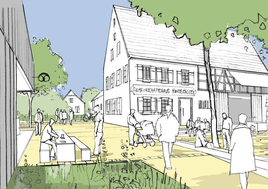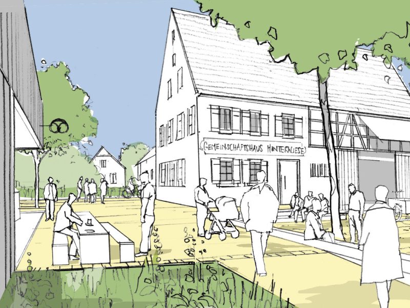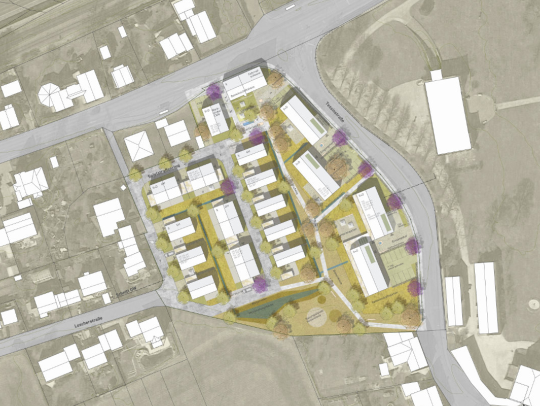 Westlich wird der Bestand durch kompakte Einfamilienhäuser arrondiert, während entlang der Tessinstraße Geschosswohnbau mit der integrierten Seniorenwohngemeinschaft aufgereiht ist. In seiner einfachen Formensprache nimmt er den Duktus landwirtschaftlicher Scheunengebäude auf. Sämtliche Neubauten haben flächige Satteldächer und eine moderate Höhenentwicklung; durch die kompakte Gebäudetypologie, die sparsamen Ausnutzung der Flächen und eine wirtschaftliche Erschließung können jedoch zeitgemäße und zukunftstaugliche Wohnadressen mit hoher Freiraumqualität entstehen. Die Seniorenwohngemeinschaft erstreckt sich über die Erdgeschosse zweiter Wohnhäuser und bündelt im eingeschossigen Verbindungsbau die Gemeinschaftsräume. Sämtliche Zimmer haben einen unmittelbaren Zugang zum westlich angrenzenden großen Garten.